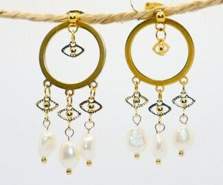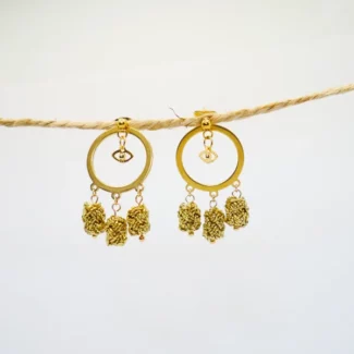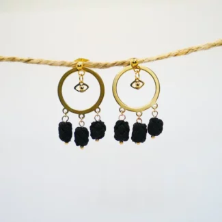 Des boucles d’oreilles délicates avec pendant oeil et perles en passementerie. Ces boucles sont réalisées de façon artisanale avec une fermeture sur clou en acier inoxydable, elles sont extrêmement légère à porter en toute occasion.