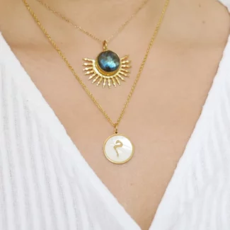 Un collier délicat en en acier inoxydable plaqué or avec un pendentif en nacre et une lettre incrusté.